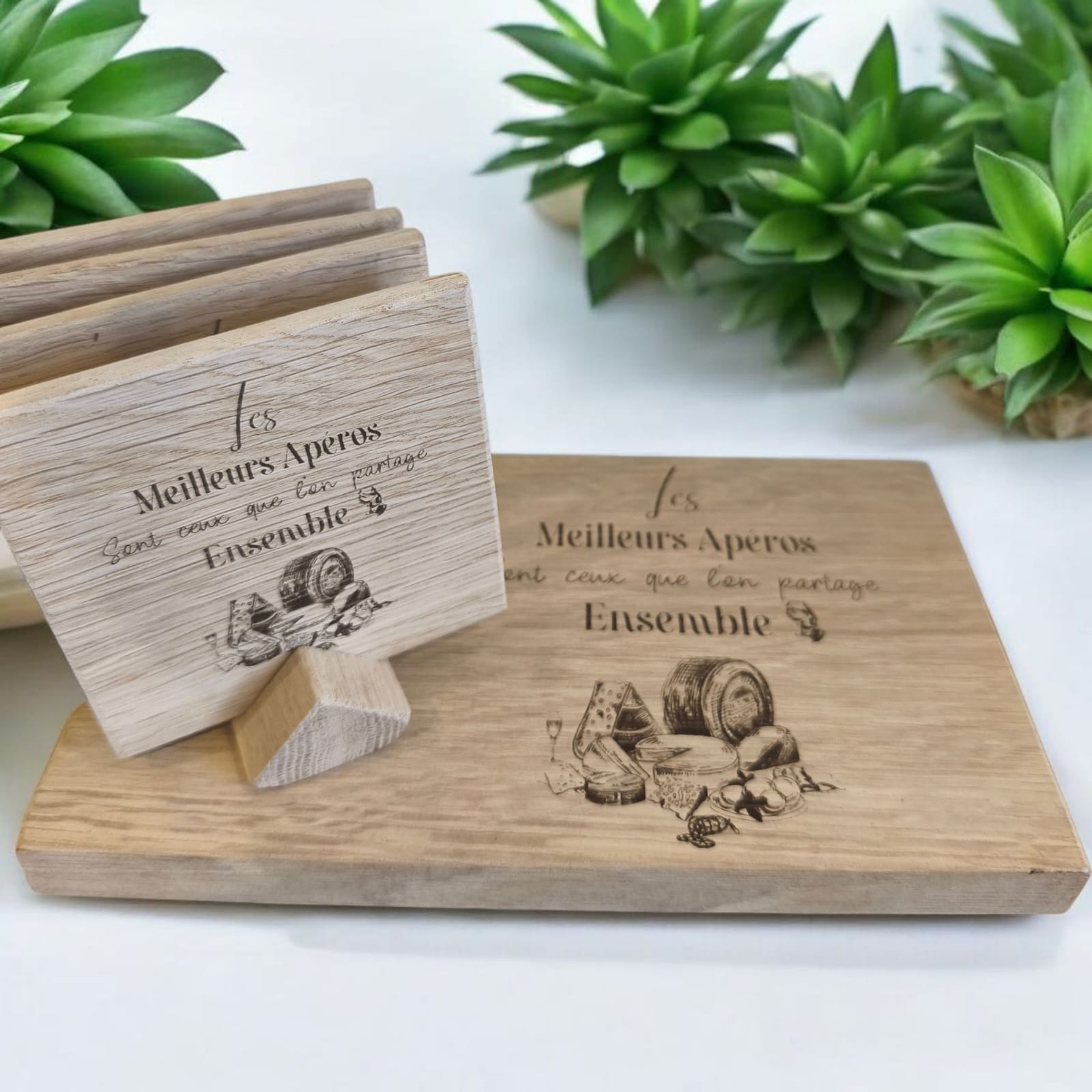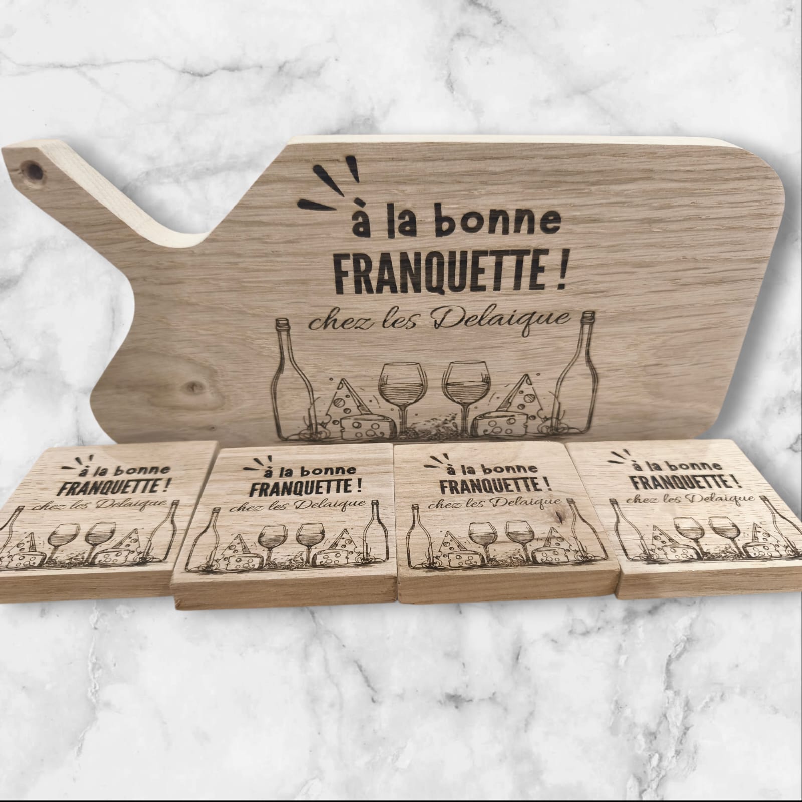 Offrez (ou offrez-vous) un ensemble unique composé d’une planche à découper et de 4 dessous de verre, personnalisés avec la gravure de votre choix: Prénom, message, photo, date etc… Chaque pièce est réalisée à partir de supports fabriqués avec soin par un ébéniste, garantissant un travail artisanal de qualité et des finitions soignées. Une création à la fois utile, esthétique et pleine de sens. Idéal pour un cadeau personnalisé à offrir.