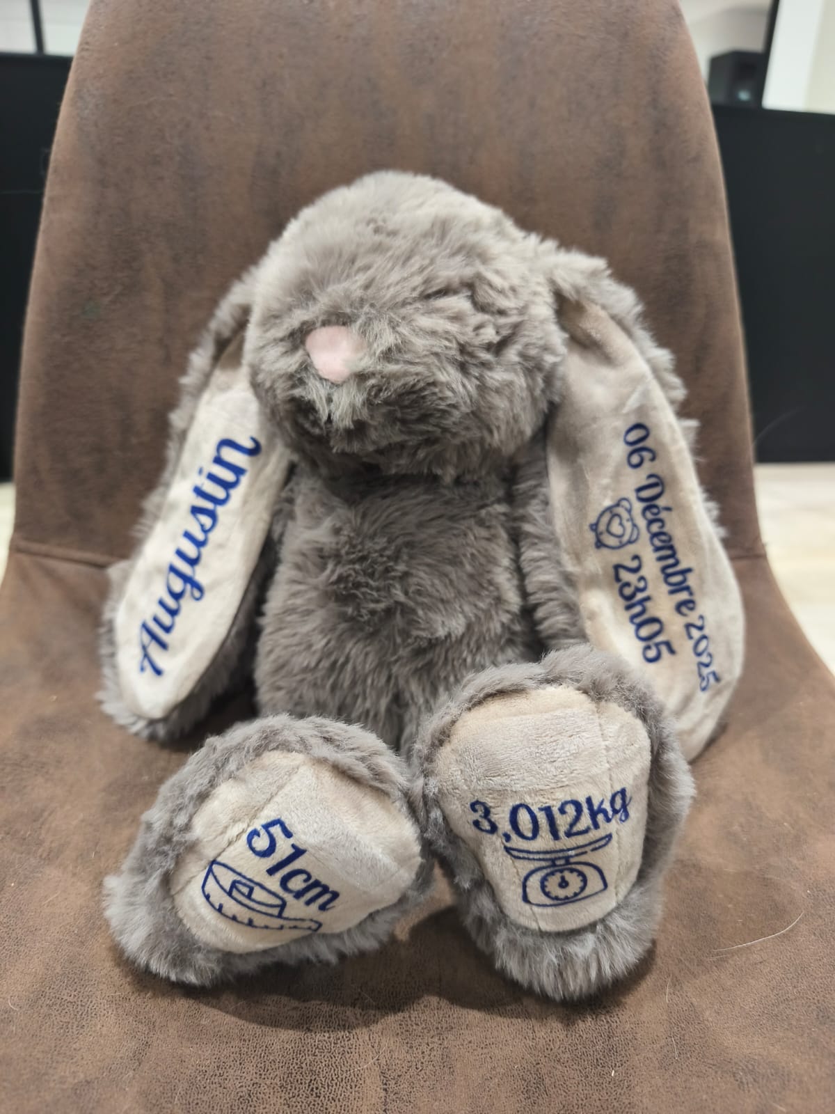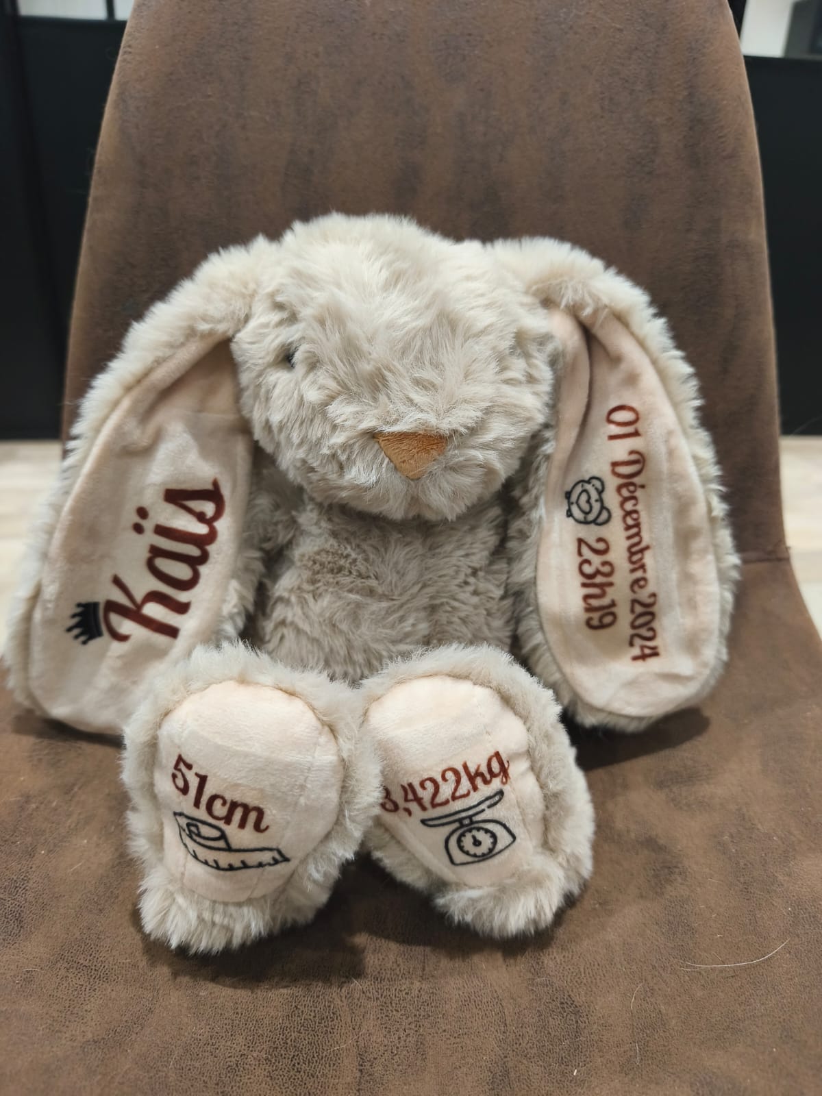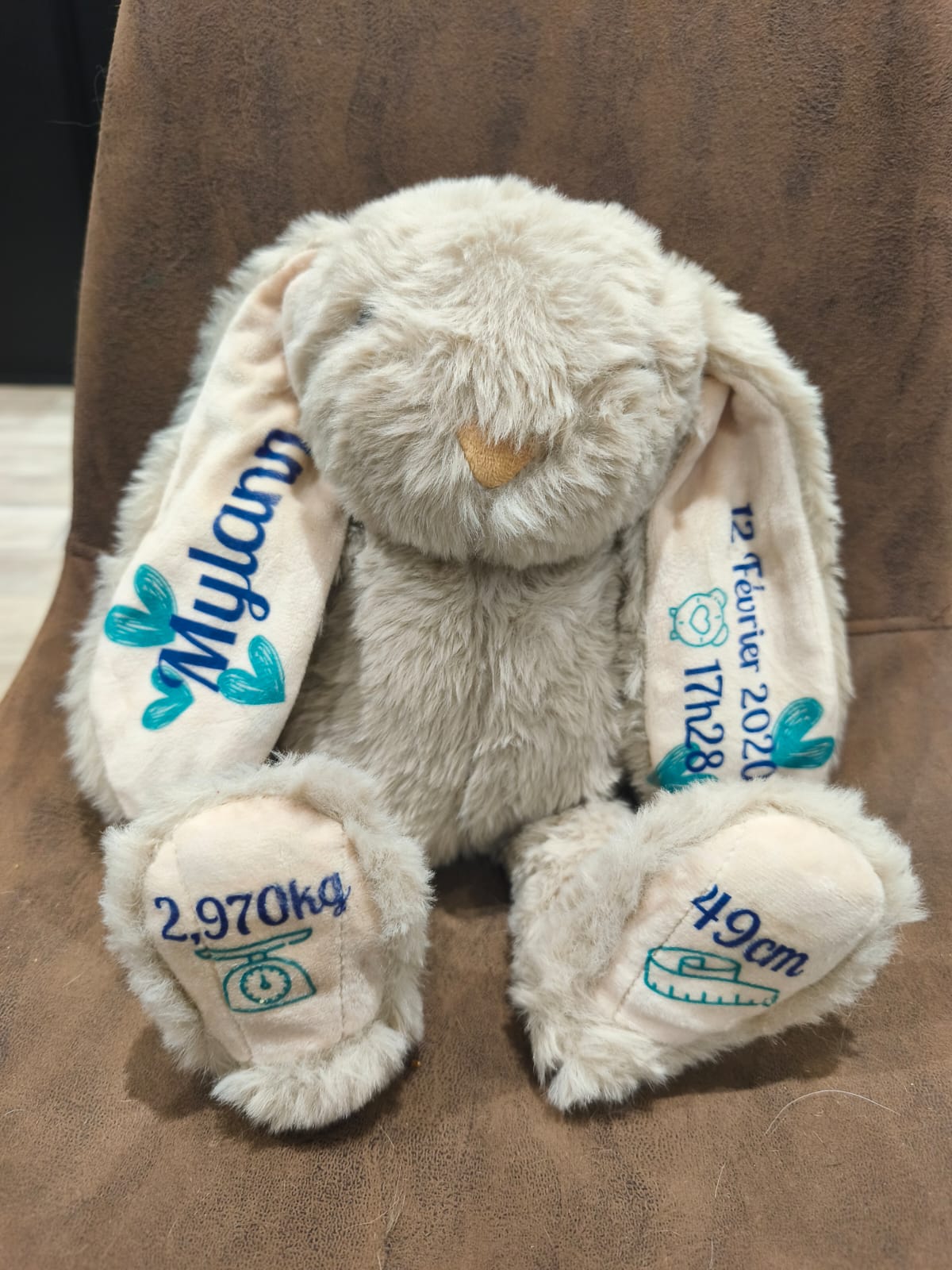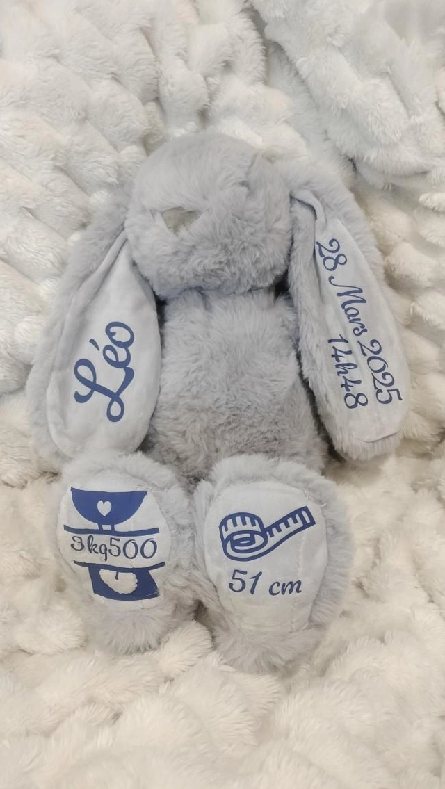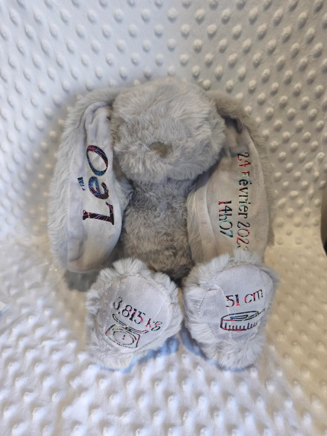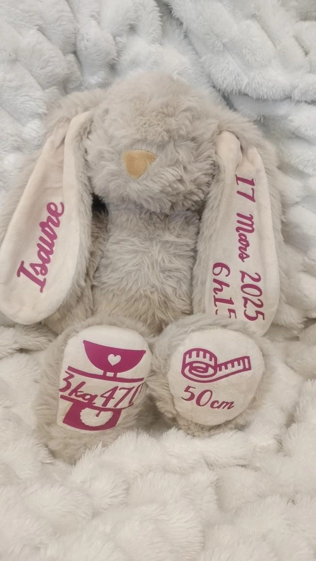 Lapin personnalisé avec le prénom de bébé, sa date de naissance, l’heure et le poids. Un souvenir tendre et unique pour célébrer l’arrivée de bébé et garder un joli souvenir de ce moment précieux.