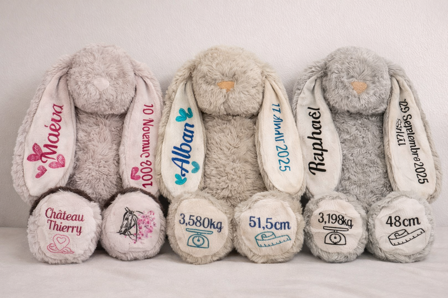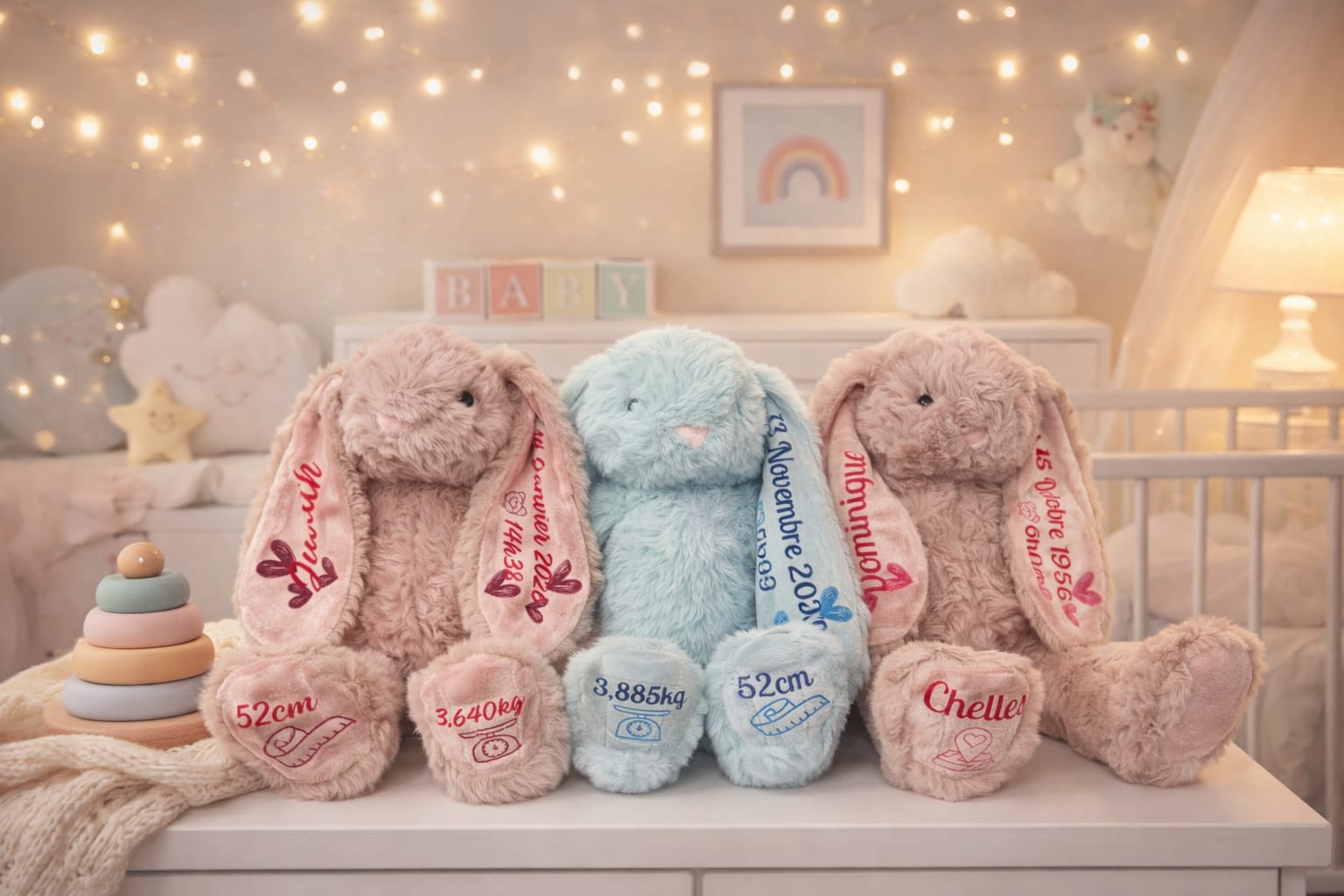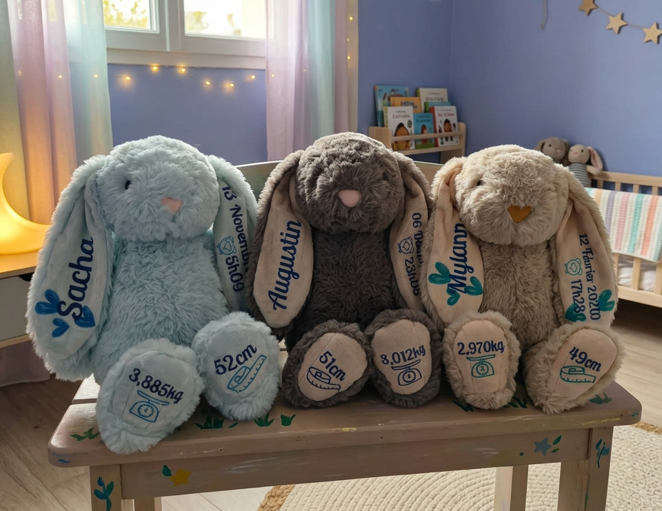 Craquez pour nos doudous personnalisés, doux et réconfortants, contiennent le prénom, la date, l’heure, le poids et la taille de naissance. Un joli souvenir parfait pour accompagner bébé au quotidien. Un souvenir unique rempli de tendresse.